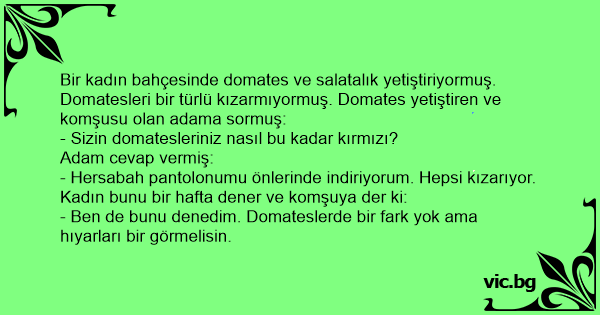 Bir kadın bahçesinde domates ve salatalık yetiştiriyormuş. Domatesleri bir türlü kızarmıyormuş. Domates yetiştiren ve komşusu olan adama sormuş: