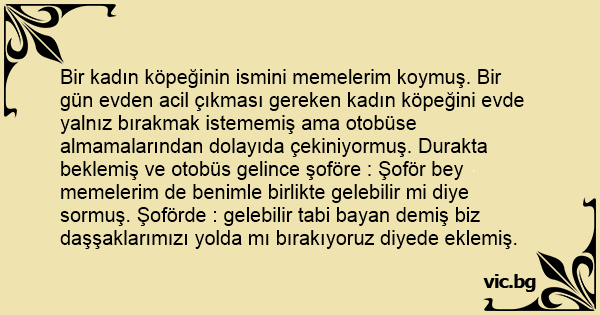 Bir kadın köpeğinin ismini memelerim koymuş. Bir gün evden acil çıkması gereken kadın köpeğini evde yalnız bırakmak istememiş ama otobüse almamalarından dolayıda çekiniyormuş. Durakta beklemiş ve otobüs gelince şoföre : Şoför bey memelerim de benimle birlikte gelebilir mi diye sormuş. Şoförde : gelebilir tabi bayan demiş biz daşşaklarımızı yolda mı bırakıyoruz diyede eklemiş.