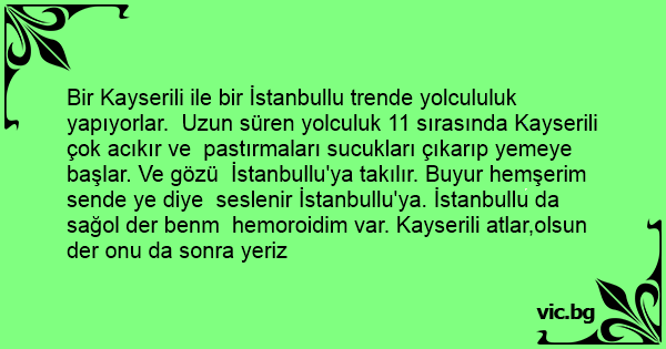 Bir Kayserili ile bir İstanbullu trende yolcululuk yapıyorlar. Uzun süren yolculuk 11 sırasında Kayserili çok acıkır ve pastırmaları sucukları çıkarıp yemeye başlar. Ve gözü İstanbullu'ya takılır. Buyur hemşerim sende ye diye seslenir İstanbullu'ya. İstanbullu da sağol der benm hemoroidim var. Kayserili atlar,olsun der onu da sonra yeriz