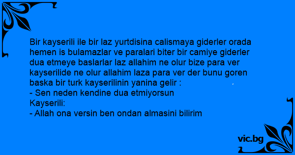 Bir kayserili ile bir laz yurtdisina calismaya giderler orada hemen is bulamazlar ve paralari biter bir camiye giderler dua etmeye baslarlar laz allahim ne olur bize para ver kayserilide ne olur allahim laza para ver der bunu goren baska bir turk kayserilinin yanina gelir :