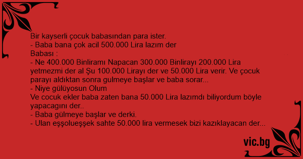 - Ne 400.000 Binliramı Napacan 300.000 Binlirayı 200.000 Lira yetmezmi der al Şu 100.000 Lirayı der ve 50.000 Lira verir. Ve çocuk parayı aldıktan sonra gulmeye başlar ve baba sorar...