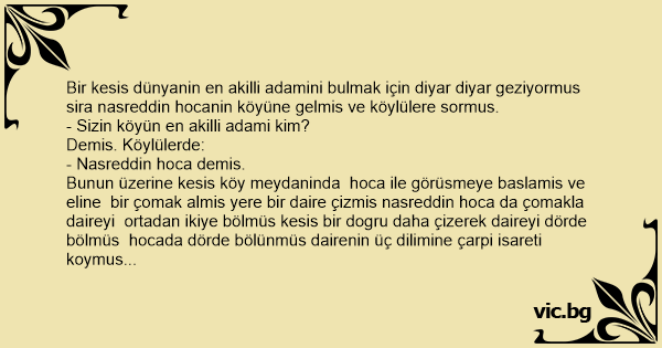 Bir kesis dünyanin en akilli adamini bulmak için diyar diyar geziyormus sira nasreddin hocanin köyüne gelmis ve köylülere sormus.