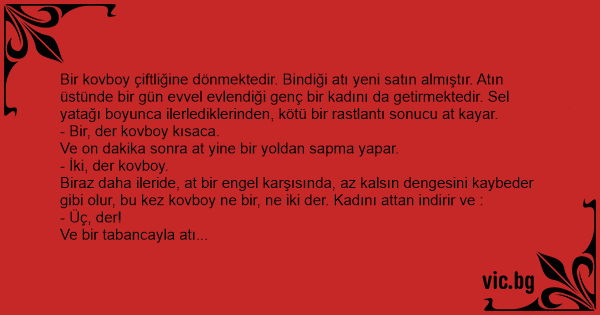 Biraz daha ileride, at bir engel karşısında, az kalsın dengesini kaybeder gibi olur, bu kez kovboy ne bir, ne iki der. Kadını аттаn indirir ve :