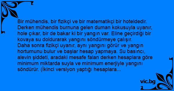 Bir matematikçi ve fizikçi fakültenin dinlenme salonun da oturup kahvelerini yudumlarken bakarlar ki, kahve makinesi tutusmuş, fizikçi hemen koşarak eline aldığı kovayı doldurarak ateşi söndürür....