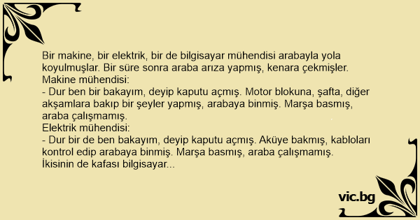 Програмист, електроинженер и механик пътуват с кола. Колата се поврежда. Механика казва: - Сигурно е ремъка. Ей сега ще погледна. Никаква полза. Електроинженера се намесва: - Чакай да видя...