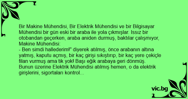 Bir Makine Mühendisi, Bir Elektrik Mühendisi ve bir Bilgisayar Mühendisi bir gün eski bir araba ile yola çıkmışlar. Issız bir otobandan geçerken, araba aniden durmuş, baktılar çalışmıyor, Makine Mühendisi:
