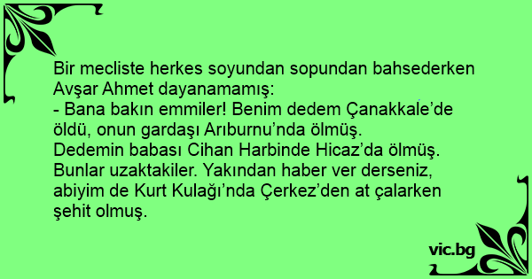 Dedemin babası Cihan Harbinde Hicaz’da ölmüş. Bunlar uzaktakiler. Yakından haber ver derseniz, abiyim de Kurt Kulağı’nda Çerkez’den at çalarken şehit olmuş.