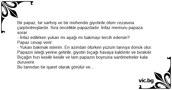 Bir papaz, bir sarhoş ve bir mühendis giyotinle ölüm cezasına çarptırılmışlardır. Sıra öncelikle papazdadır. İnfaz memuru papaza sorar: