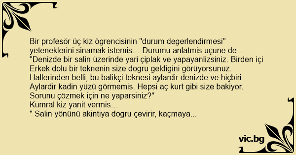 Bir profesör üç kiz ögrencisinin "durum degerlendirmesi" yeteneklerini sinamak istemis… Durumu anlatmis üçüne de ..