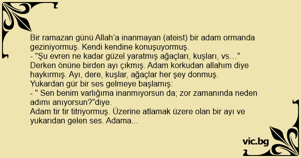 Adam tir tir titriyormuş. Üzerine atlamak üzere olan bir ayı ve yukarıdan gelen ses. Adama bir hayli korkmuş. Konuşmaya başlamış: