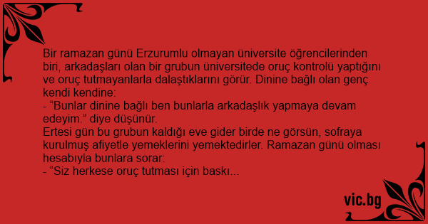 Ertesi gün bu grubun kaldığı eve gider birde ne görsün, sofraya kurulmuş afiyetle yemeklerini yemektedirler. Ramazan günü olması hesabıyla bunlara sorar: