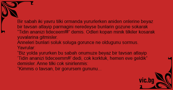 Bir sabah iki yavru tilki ormanda yururlerken aniden onlerine beyaz bir tavsan atlayip parmagini neredeyse bunlarin gozune sokarak “Tidin ananizi tideceem!!!” demis. Odleri kopan minik tilkiler kosarak yuvalarina gitmisler.