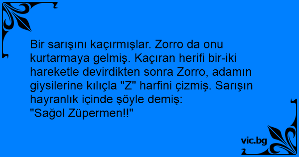 Bir sarışını kaçırmışlar. Zorro da onu kurtarmaya gelmiş. Kaçıran herifi bir-iki hareketle devirdikten sonra Zorro, adamın giysilerine kılıçla "Z" harfini çizmiş. Sarışın hayranlık içinde şöyle demiş: