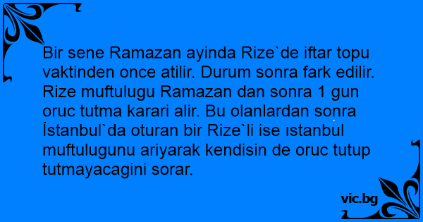 Bir sene Ramazan ayinda Rize`de iftar topu vaktinden once atilir. Durum sonra fark edilir. Rize muftulugu Ramazan dan sonra 1 gun oruc tutma karari alir. Bu olanlardan sonra İstanbul`da oturan bir Rize`li ise ıstanbul muftulugunu ariyarak kendisin de oruc tutup tutmayacagini sorar.