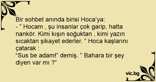 - ” Hocam , şu insanlar çok garip, hatta nankör. Kimi kışın soğuktan , kimi yazın sıcaktan şikayet ederler. ” Hoca kaşlarını çatarak :