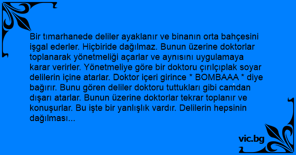 Bir tımarhanede deliler ayaklanır ve binanın orta bahçesini işgal ederler. Hiçbiride dağılmaz. Bunun üzerine doktorlar toplanarak yönetmeliği açarlar ve aynısını uygulamaya karar verirler. Yönetmeliye göre bir doktoru çırılçıplak soyar delilerin içine atarlar. Doktor içeri girince * BOMBAAA * diye bağırır. Bunu gören deliler doktoru tuttukları gibi camdan dışarı atarlar. Bunun üzerine doktorlar tekrar toplanır ve konuşurlar. Bu işte bir yanlışlık vardır. Delilerin hepsinin dağılması gerekmektedir. Yeniden denerler. Bir doktoru daha soyup içeri atarlar ve oda * BOMBAAA * diye bağırır. Deliler onu da tuttukları gibi camdan dışarı atarlar. Başhekim en sonunda bir de ben deniyeyim der ve soyunup delilerin arasına girer ve * BOMBAAA * diye bağırır. Bunun üzerine bütün deliler kaçışır ve binayı ve orta bahçeyi terk ederler. Doktorlar merak eder ve biraz akıllı olanlarından toplayarak bu durumu sorarlar. Niçin siz ilk iki doktor girdiğinde binayı boşaltmadınız da son başhekim girdiğinde boşaltınız? derler. Delilerde