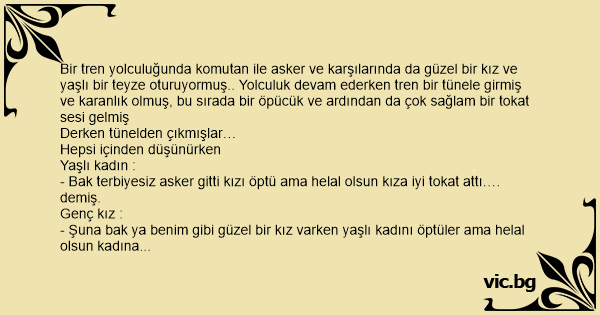 - Bak terbiyesiz asker gitti kızı öptü ama helal olsun kıza iyi tokat attı…. demiş.