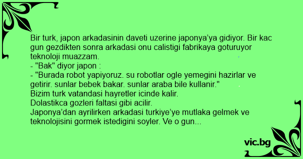 Bir turk, japon arkadasinin daveti uzerine japonya’ya gidiyor. Bir kac gun gezdikten sonra arkadasi onu calistigi fabrikaya goturuyor teknoloji muazzam.