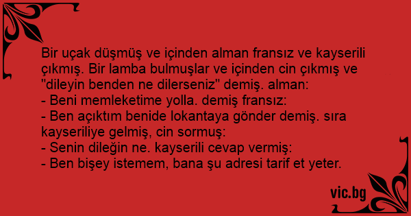 Bir uçak düşmüş ve içinden alman fransız ve kayserili çıkmış. Bir lamba bulmuşlar ve içinden cin çıkmış ve "dileyin benden ne dilerseniz" demiş. alman: