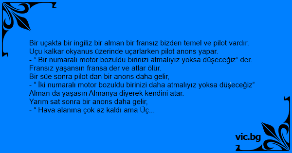 Bir uçakta bir ingiliz bir alman bir fransız bizden temel ve pilot vardır.