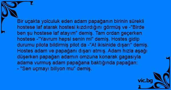 Се возел еден патник во авион и со себе го носел папагалот. Поминала стјуардесата и папагалот ја треснал по задникот. Девојката премолчела. Се охрабрил сопственикот на папагалот, па и тој ја плеснал по задникот. По некое време, стјуардесата се вратила со капетанот. Ги фатиле непристојните патници...