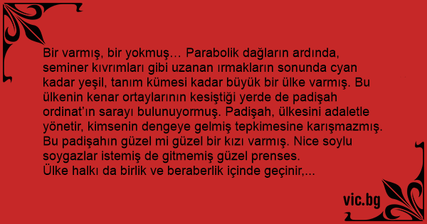 Bir varmış, bir yokmuş… Parabolik dağların ardında, seminer kıvrımları gibi uzanan ırmakların sonunda cyan kadar yeşil, tanım kümesi kadar büyük bir ülke varmış. Bu ülkenin kenar ortaylarının kesiştiği yerde de padişah ordinat’ın sarayı bulunuyormuş. Padişah, ülkesini adaletle yönetir, kimsenin dengeye gelmiş tepkimesine karışmazmış. Bu padişahın güzel mi güzel bir kızı varmış. Nice soylu soygazlar istemiş de gitmemiş güzel prenses.