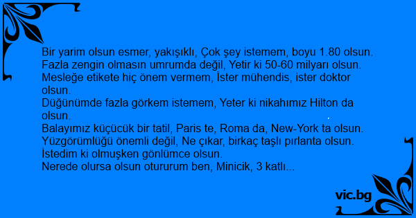 Bir yarim olsun esmer, yakışıklı, Çok şey istemem, boyu 1.80 olsun.