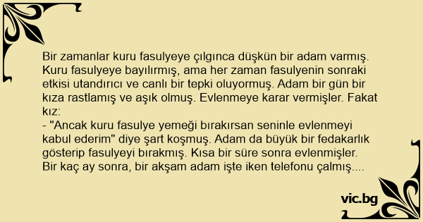 Bir zamanlar kuru fasulyeye çılgınca düşkün bir adam varmış. Kuru fasulyeye bayılırmış, ama her zaman fasulyenin sonraki etkisi utandırıcı ve canlı bir tepki oluyormuş. Adam bir gün bir kıza rastlamış ve aşık olmuş. Evlenmeye karar vermişler. Fakat kız: