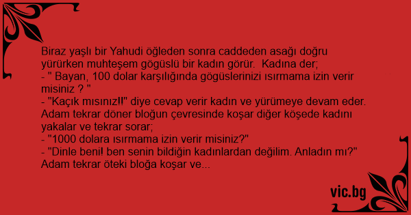 Biraz yaşlı bir Yahudi öğleden sonra caddeden asağı doğru yürürken muhteşem gögüslü bir kadın görür. Kadına der;