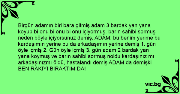 Birgün adamın biri bara gitmiş adam 3 bardak yan yana koyup bi onu bi onu bi onu içiyormuş. barın sahibi sormuş neden böyle içiyorsunuz demiş. ADAM; bu benim yerime bu kardaşımın yerine bu da arkadaşımın yerine demiş 1. gün öyle içmiş 2. Gün öyle içmiş 3. gün adam 2 bardak yan yana koymuş ve barın sahibi sormuş noldu kardaşınız mı arkadaşınızmı öldü, hastalandı demiş ADAM da demişki BEN RAKIYI BIRAKTIM DA!