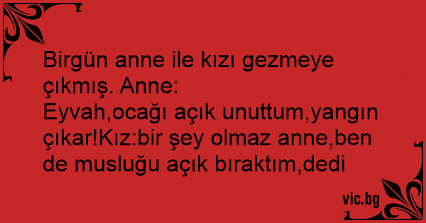 Birgün anne ile kızı gezmeye çıkmış. Anne: Eyvah,ocağı açık unuttum,yangın çıkar!Kız:bir şey olmaz anne,ben de musluğu açık bıraktım,dedi