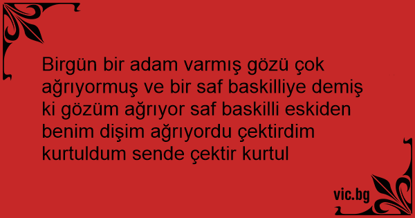 Birgün bir adam varmış gözü çok ağrıyormuş ve bir saf baskilliye demiş ki gözüm ağrıyor saf baskilli eskiden benim dişim ağrıyordu çektirdim kurtuldum sende çektir kurtul