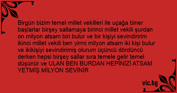 Birgün bizim temel millet vekilleri ile uçağa biner başlarlar birşey sallamaya birinci millet vekili şurdan on milyon atsam biri bulur ve bir kişiyi sevindiririm ikinci millet vekili ben yirmi milyon atsam iki kişi bulur ve ikikişiyi sevindirimiş olurum üçüncü dördüncü derken hepsi birşey sallar sıra temele gelir temel düşünür ve ULAN BEN BURDAN HEPİNİZİ ATSAM YETMİŞ MİLYON SEVİNİR