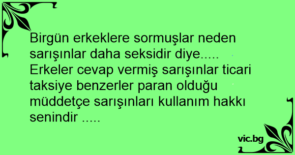 Birgün erkeklere sormuşlar neden sarışınlar daha seksidir diye..... Erkeler cevap vermiş sarışınlar ticari taksiye benzerler paran olduğu müddetçe sarışınları kullanım hakkı senindir .....