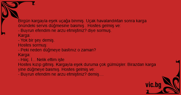 Birgün kargayla eşek uçağa binmiş. Uçak havalandıktan sonra karga önündeki servis düğmesine basmış . Hostes gelmiş ve:
