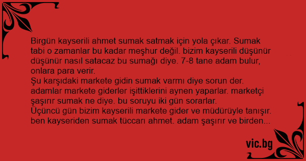 Birgün kayserili ahmet sumak satmak için yola çıkar. Sumak tabi o zamanlar bu kadar meşhur değil. bizim kayserili düşünür düşünür nasıl satacaz bu sumağı diye. 7-8 tane adam bulur, onlara para verir.