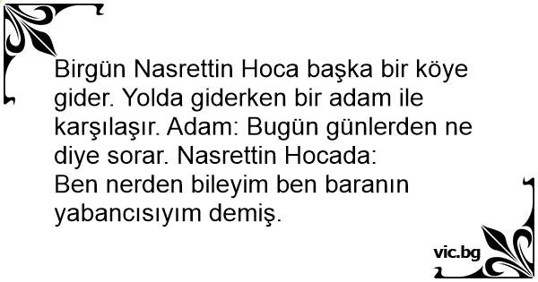 Birgün Nasrettin Hoca başka bir köye gider. Yolda giderken bir adam ile karşılaşır. Adam: Bugün günlerden ne diye sorar. Nasrettin Hocada: