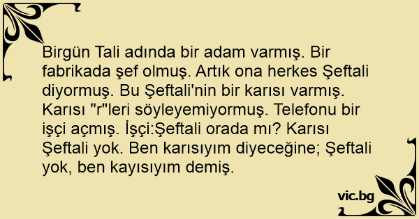 Karısı "r"leri söyleyemiyormuş. Telefonu bir işçi açmış. İşçi:Şeftali orada mı? Karısı Şeftali yok. Ben karısıyım diyeceğine; Şeftali yok, ben kayısıyım demiş.