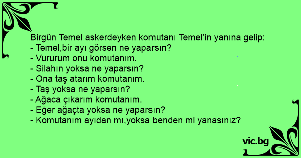 Birgün Temel askerdeyken komutanı Temel’in yanına gelip: