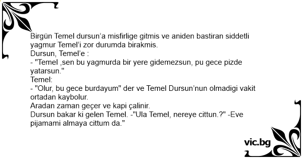 - "Temel ,sen bu yagmurda bir yere gidemezsun, pu gece pizde yatarsun."