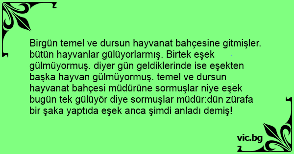 Birgün temel ve dursun hayvanat bahçesine gitmişler. bütün hayvanlar gülüyorlarmış. Birtek eşek gülmüyormuş. diyer gün geldiklerinde ise eşekten başka hayvan gülmüyormuş. temel ve dursun hayvanat bahçesi müdürüne sormuşlar niye eşek bugün tek gülüyör diye sormuşlar müdür:dün zürafa bir şaka yaptıda eşek anca şimdi anladı demiş!