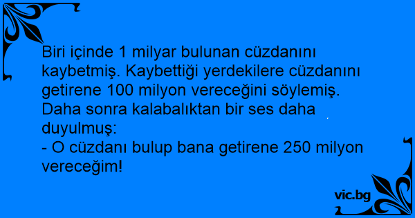 Biri içinde 1 milyar bulunan cüzdanını kaybetmiş. Kaybettiği yerdekilere cüzdanını getirene 100 milyon vereceğini söylemiş. Daha sonra kalabalıktan bir ses daha duyulmuş: