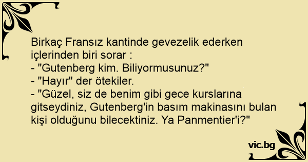 - "Güzel, siz de benim gibi gece kurslarına gitseydiniz, Gutenberg'in basım makinasını bulan kişi olduğunu bilecektiniz. Ya Panmentier'i?"