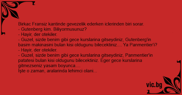 - Guzel, sizde benim gibi gece kurslarina gitseydiniz, Gutenberg'in basim makinasini bulan kisi oldugunu bilecektiniz.... Ya Panmentier'i?