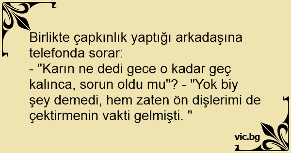 - "Karın ne dedi gece o kadar geç kalınca, sorun oldu mu"? - "Yok biy şey demedi, hem zaten ön dişlerimi de çektirmenin vakti gelmişti. "