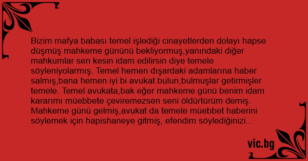 Bizim mafya babası temel işlediği cinayetlerden dolayı hapse düşmüş mahkeme gününü bekliyormuş,yanındaki diğer mahkumlar sen kesin idam edilirsin diye temele söyleniyolarmış. Temel hemen dışardaki adamlarına haber salmış,bana hemen iyi bi avukat bulun,bulmuşlar getirmişler temele. Temel avukata,bak eğer mahkeme günü benim idam kararımı müebbete çeviremezsen seni öldürtürüm demiş. Mahkeme günü gelmiş,avukat da temele müebbet haberini söylemek için hapishaneye gitmiş, efendim söylediğinizi yerine getirdim. Temel sevinerek aferin demiş,peki nasıl becerdin bu işi söyle bakalım demiş,avukat da;hiç sormayın efendim,berat kararını müebbete çevirene kadar ANAM AĞLADI demiş