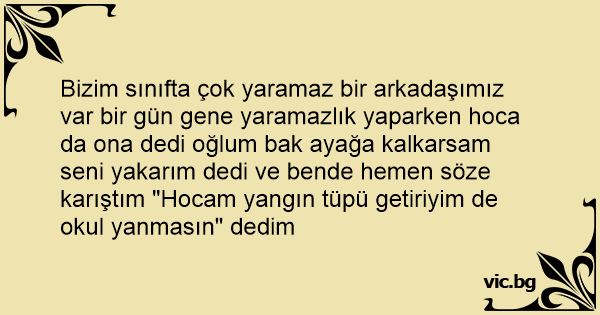 Bizim sınıfta çok yaramaz bir arkadaşımız var bir gün gene yaramazlık yaparken hoca da ona dedi oğlum bak ayağa kalkarsam seni yakarım dedi ve bende hemen söze karıştım "Hocam yangın tüpü getiriyim de okul yanmasın" dedim