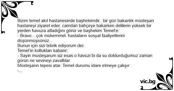 Bizim temel akıl hastanesinde başhekimdir.. bir gün bakanlık müsteşarı hastaneyi ziyaret eder. camdan bahçeye bakarken delilerin yüksek bir yerden havuza atladığını görür ve başhekim Temel’e: