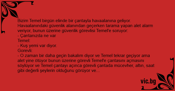 - O zaman bir daha geçin bakalım diyor ve Temel tekrar geçiyor ama alet yine ötüyor bunun üzerine görevli Temel'e çantasını açmasını söylüyor ve Temel çantayı açınca görevli çantada mücevher, altın, saat gibi değerli şeylerin olduğunu görüyor ve Temel'e soruyor: