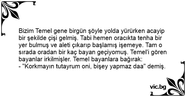 Bizim Temel gene birgün şöyle yolda yürürken acayip bir şekilde çişi gelmiş. Tabi hemen oracıkta tenha bir yer bulmuş ve aleti çıkarıp başlamış işemeye. Tam o sırada oradan bir kaç bayan geçiyomuş. Temel'i gören bayanlar irkilmişler. Temel bayanlara bağırak: